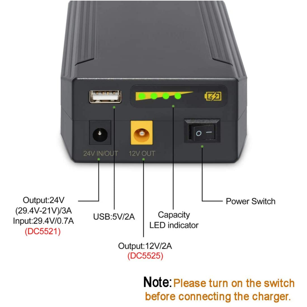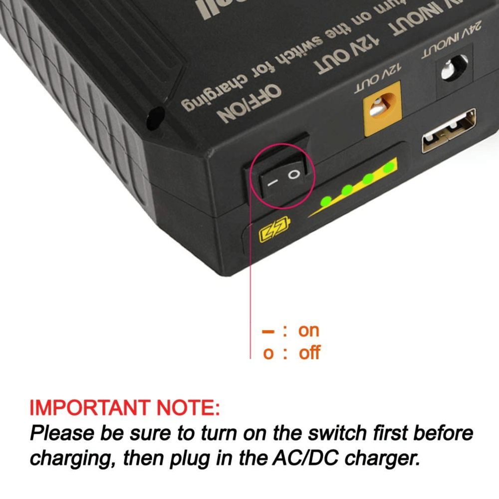 Bitte prüfen Sie vor der Verwendung dieses Lithium-Akkupacks die Spannung Ihres Geräts. Geräte mit niedriger Spannung dürfen nicht an den Ausgang mit hoher Spannung angeschlossen werden.