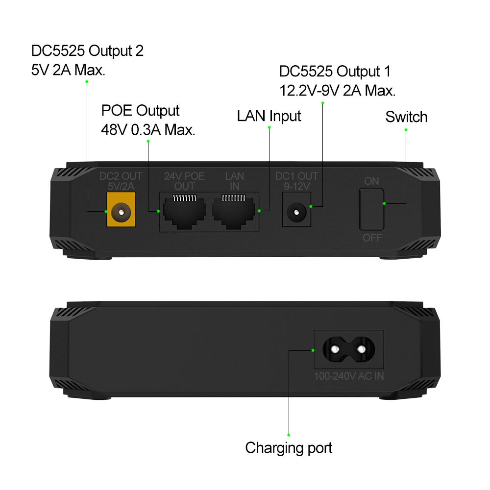 Neben der POE-Funktion verfügt das Gerät über zwei DC-Ausgangsoptionen, wodurch Nutzer zusätzliche Hilfsgeräte gleichzeitig mit POE-Geräten betreiben können.