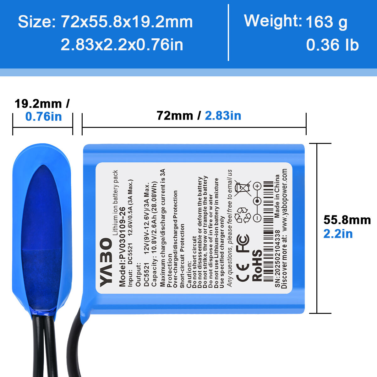 The YABO 12V 2600mAh Rechargeable Lithium-ion Battery Pack is designed for users who need lightweight, compact, and dependable 12V power for small electronic systems and DIY applications. This model focuses on portability and simplicity, making it an excellent choice for low-power devices where space, weight, and ease of installation matter most.